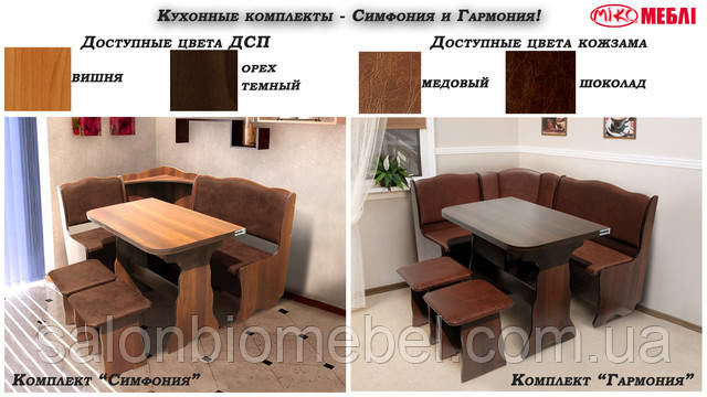 Кухонні комплекти складаються з куточка з взаємозамінним кутом, розкладного кухонного столу і двох стільців. Корпус виготовлений з ЛДСП, оббивка ― шкірозамінник.