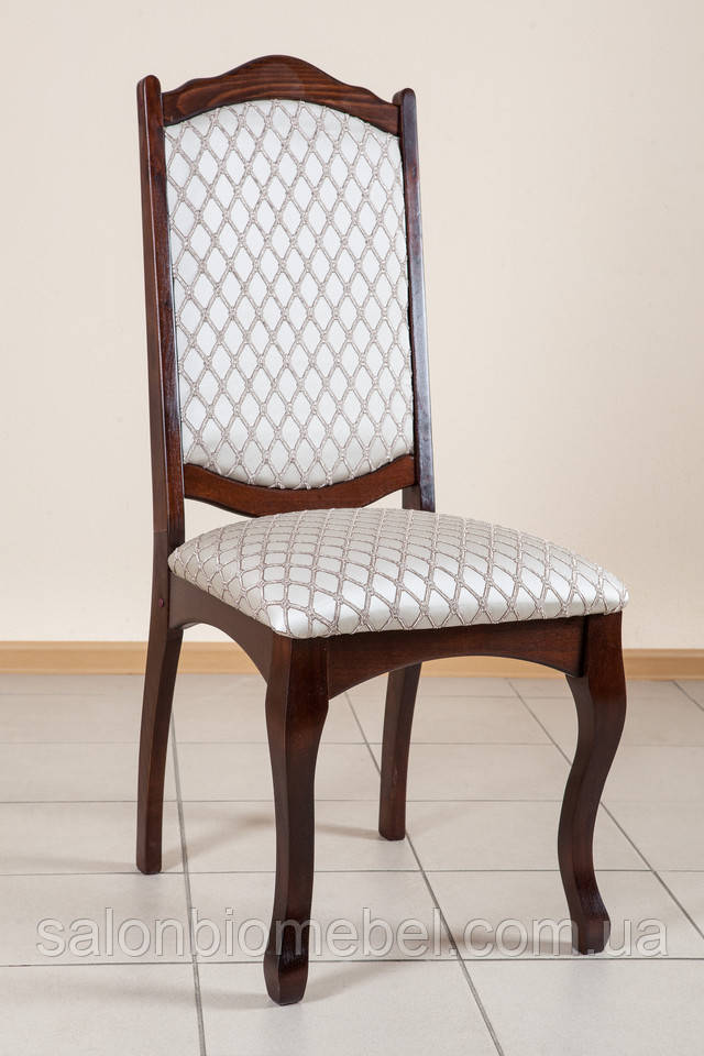 Дерев'яний обідній стілець із м'яким сидінням і спинкою, оббитими тканиною.